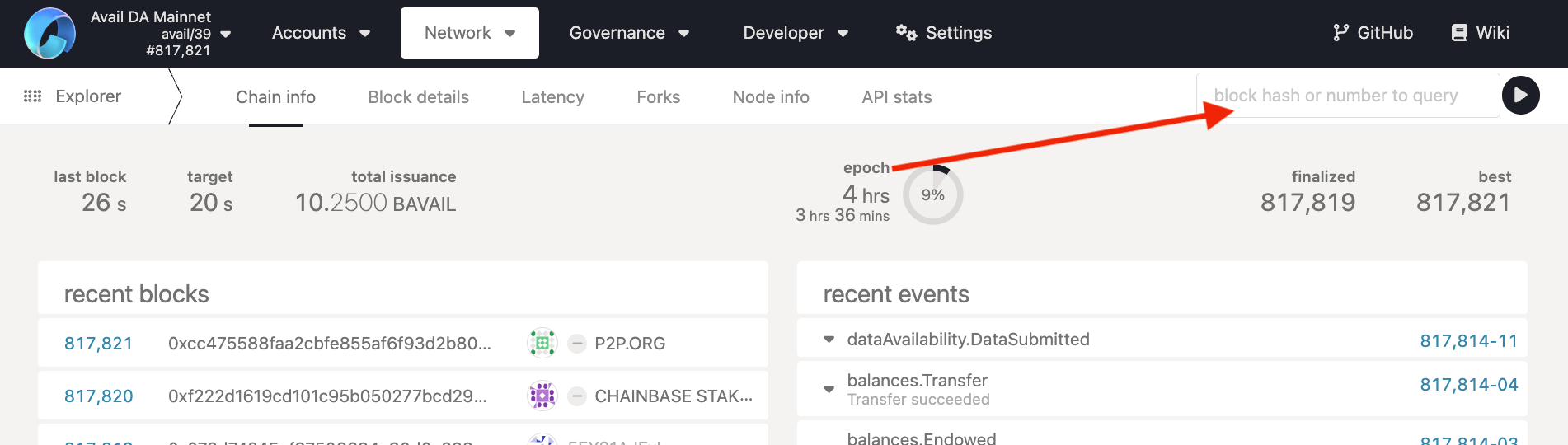 1. Depending on the network you are on, click on live networks -> Avail DA network, or test network -> Avail Turing testnet.