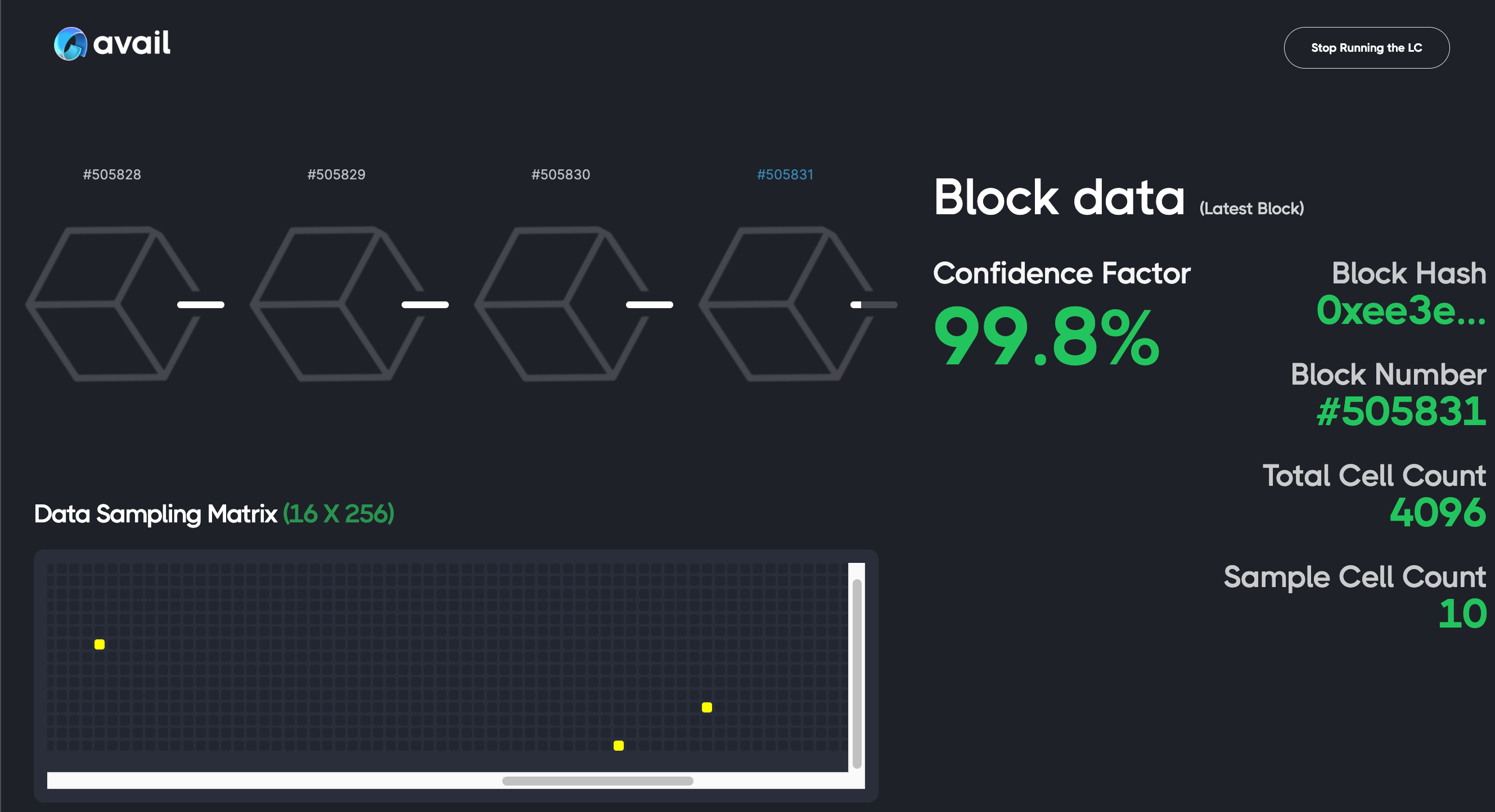 This screenshot is from a purely in-browser interface built by the Avail team that uses a light client to determine the confidence of blocks in real time. You can check it out at light.avail.tools .