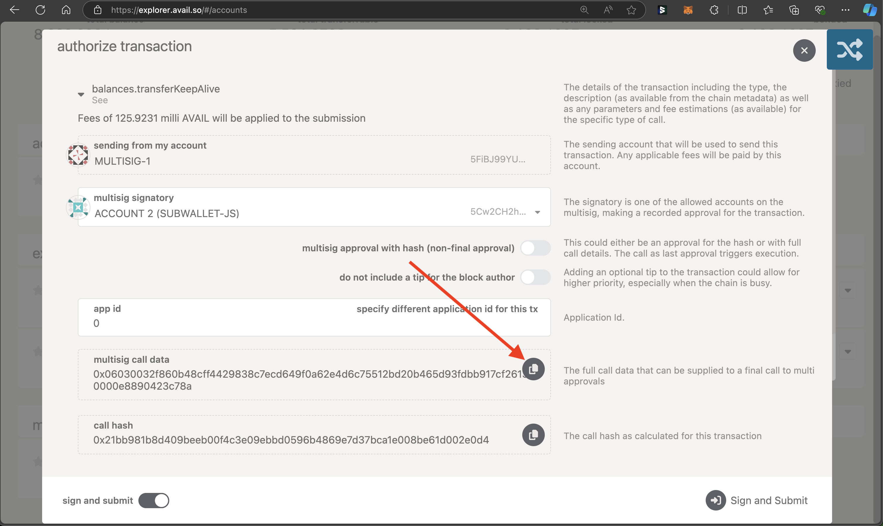 3. Then, click on Sign and Submit and execute the transaction.