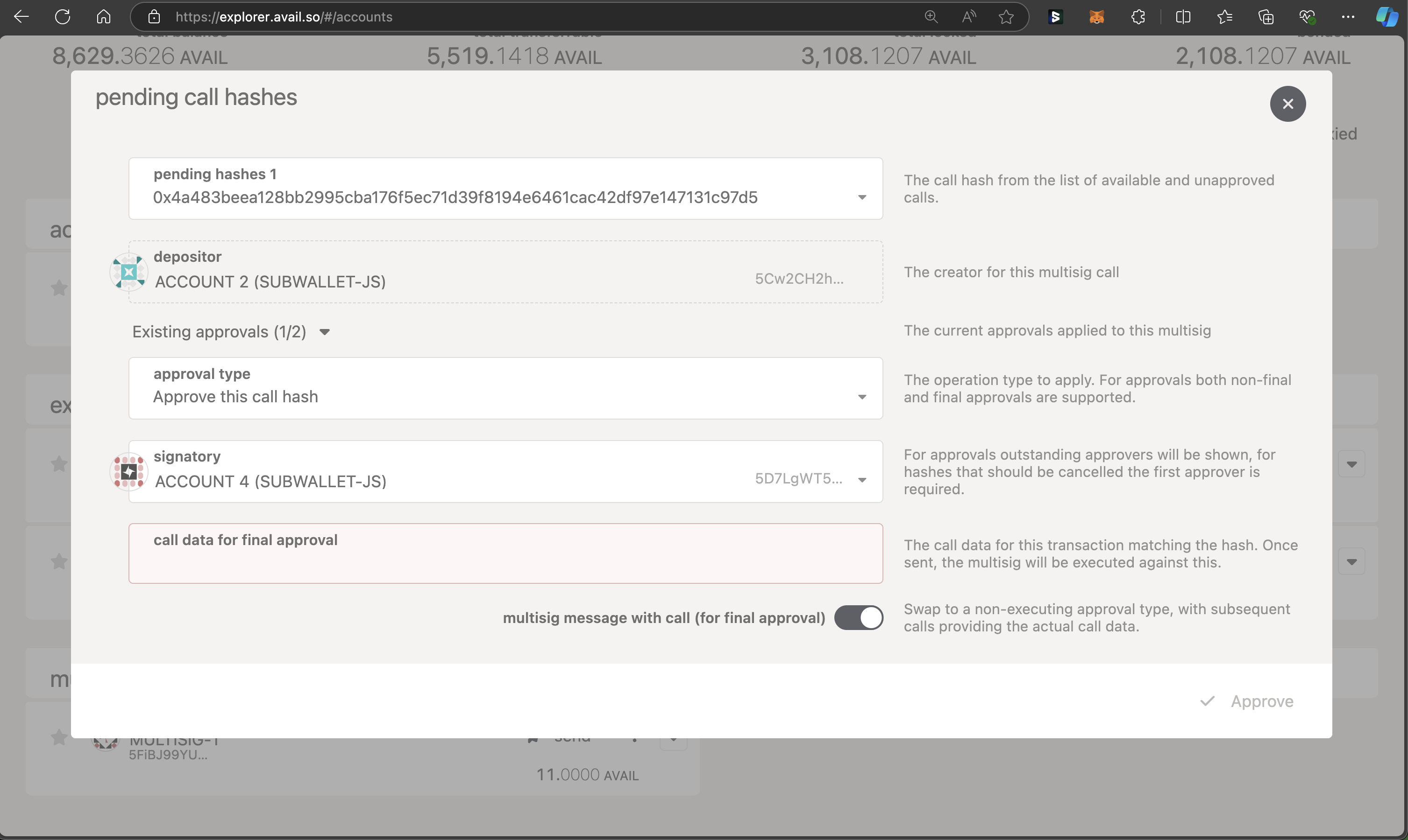 But what if you simply want to approve the transaction without executing it? Avail DA’s multisig implementation allows for this functionality too. Let us say you are the final signatory whose approval will mean the transaction has enough approvals to be executed.