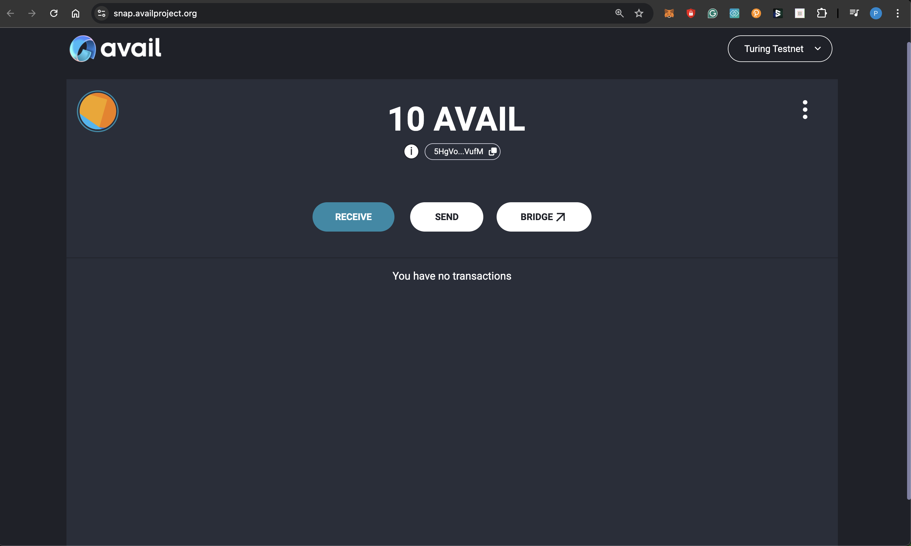 Please note that the bridge button takes you to a different interface that you can use to transfer tokens between Avail DA and Ethereum. The bridge UI does not yet support the Avail Snap.