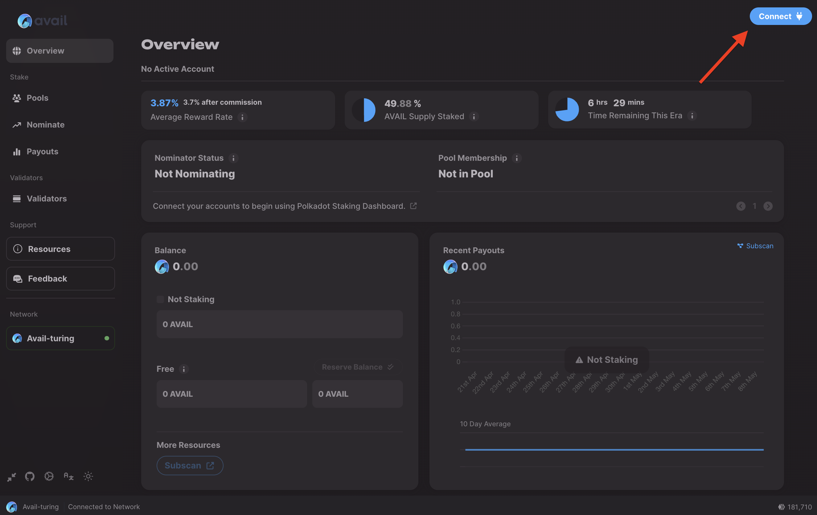 Go to the staking dashboard page , and connect your wallet by clicking on the connect button on the top right. The dashboard supports a variety of different options.